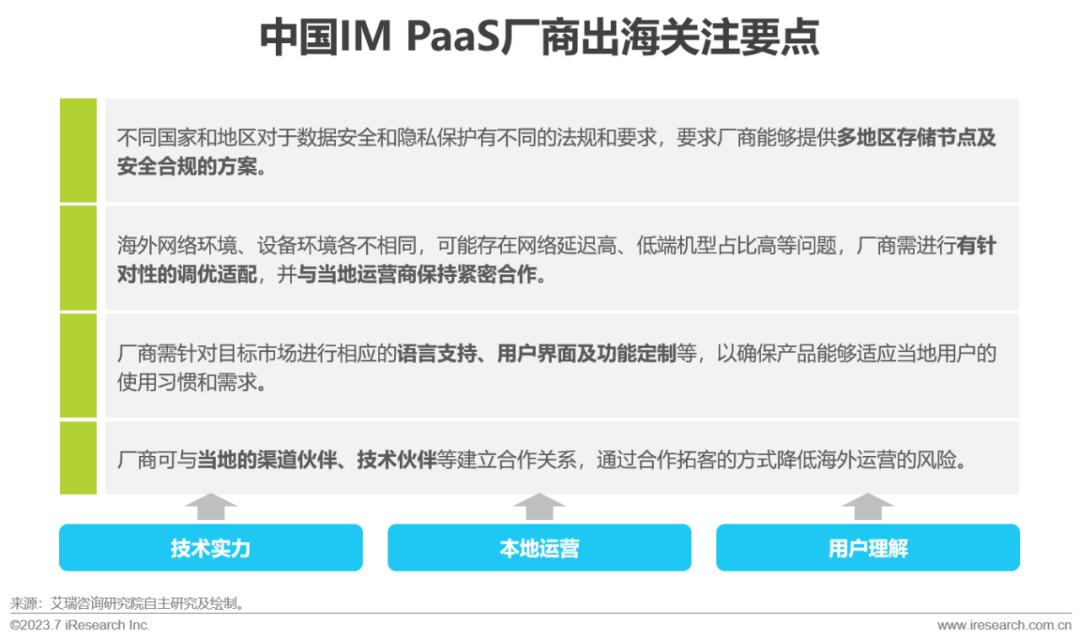 互联网企业的出海为中国的IM PaaS厂商的全球化布局提供了良好的基础。随着国际地缘政治形势的变化,数据安全、合规的重要性日益突出,中国IM PaaS在出海的过程中应首先关注不同地区的政策要求。此外,厂商还需要针对目的地国的网络基础设施、终端设备及运营商等进行针对性适配,并提供多语言的官网、产品文档及控制台。由于不同国家的经济环境、政治背景、文化风俗等存在差异,IM PaaS厂商如同时具备海外市场C端产品的运营经验,将可以在一定程度上规避上述风险。