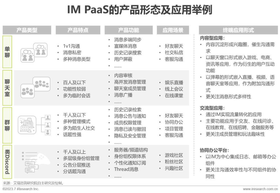 IM PaaS是基于互联网通信原理的即时通讯平台服务。《2023年全球即时通讯(IM)PaaS市场洞察白皮书》针对IM PaaS行业的发展历程、核心价值、主要功能及商业模式等进行系统性研究,并在产品形态及创新应用场景等方面展开分析,探讨IM PaaS与AIGC、元宇宙等新概念的结合点。