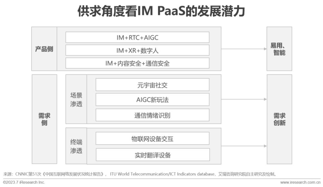 从整体市场上看,中高收入国家的通信需求相对稳定,低收入国家是未来互联网通信的增长主力。从供给侧看,大部分IM PaaS厂商都基于IM与RTC和AIGC的契合点,提升产品功能深度与场景广度,同时强化消息安全管理能力,朝着元宇宙无感互联、沉浸式沟通的方向发展,为用户带来更多惊喜与新奇体验。从需求侧看,IM PaaS的企业端应用主要围绕协同办公,虽然市场相对饱和,但仍为企业刚需场景,未来将维持稳定增长。在个人端可拓展场景较多,如挖掘兴趣共鸣释放用户沟通需求,在聊天中加入AIGC能力辅助进行话题引导和消息管理,在通信中结合情绪识别或实时翻译实现无感沟通等,都能让用户更有亲切感和归属感,提升沟通意愿。