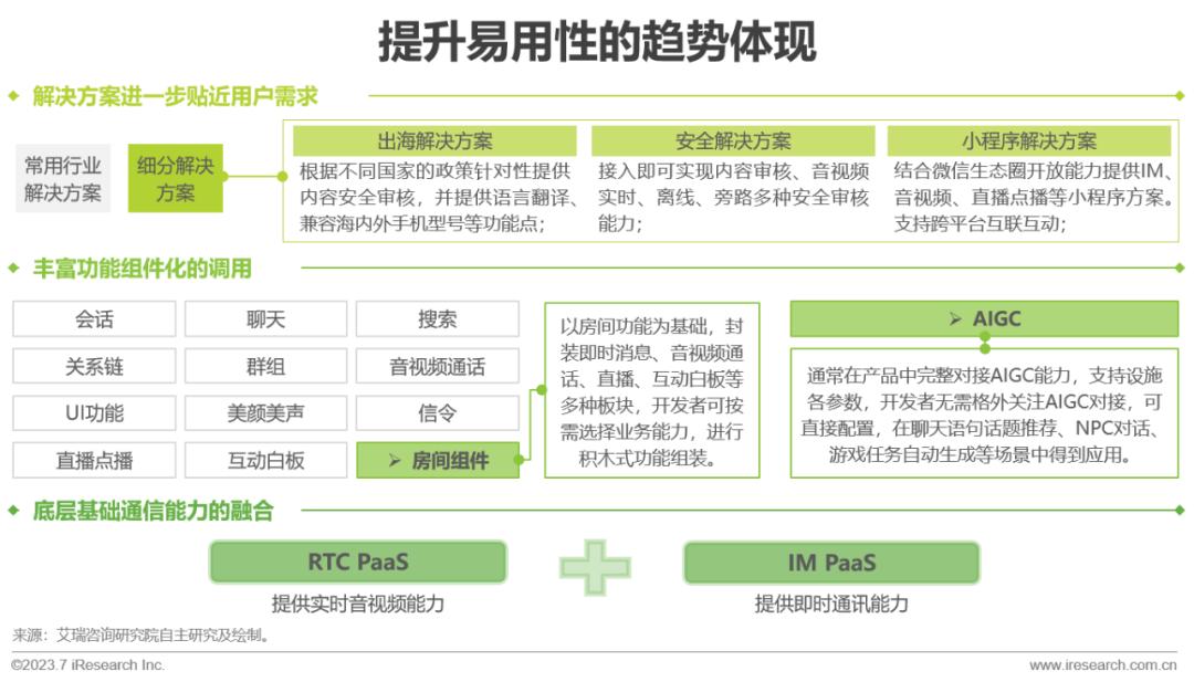提升开发者的易用性体验是IM PaaS厂商长期关注的竞争重点,这种易用性主要体现在底层基础能力的融合、丰富功能组件化调用,以及进一步推出更贴合客户需求的解决方案上。底层能力的融合减少开发者寻找RTC能力的时间,并进一步丰富上层封装的场景组件,从而提升开发效率。此外,越来越多厂商提供的场景化SDK为开发者提供贴近业务的API回调,也存在部分厂商开始提供可采用低代码形式开发的组件,更简单便捷的实现产品搭建。对于近期比较火热的出海需求,也有厂商提供针对出海的解决方案,以及一些安全、小程序等开发者需求度高但场景更为细化的解决方案,以进一步贴近开发者需求。