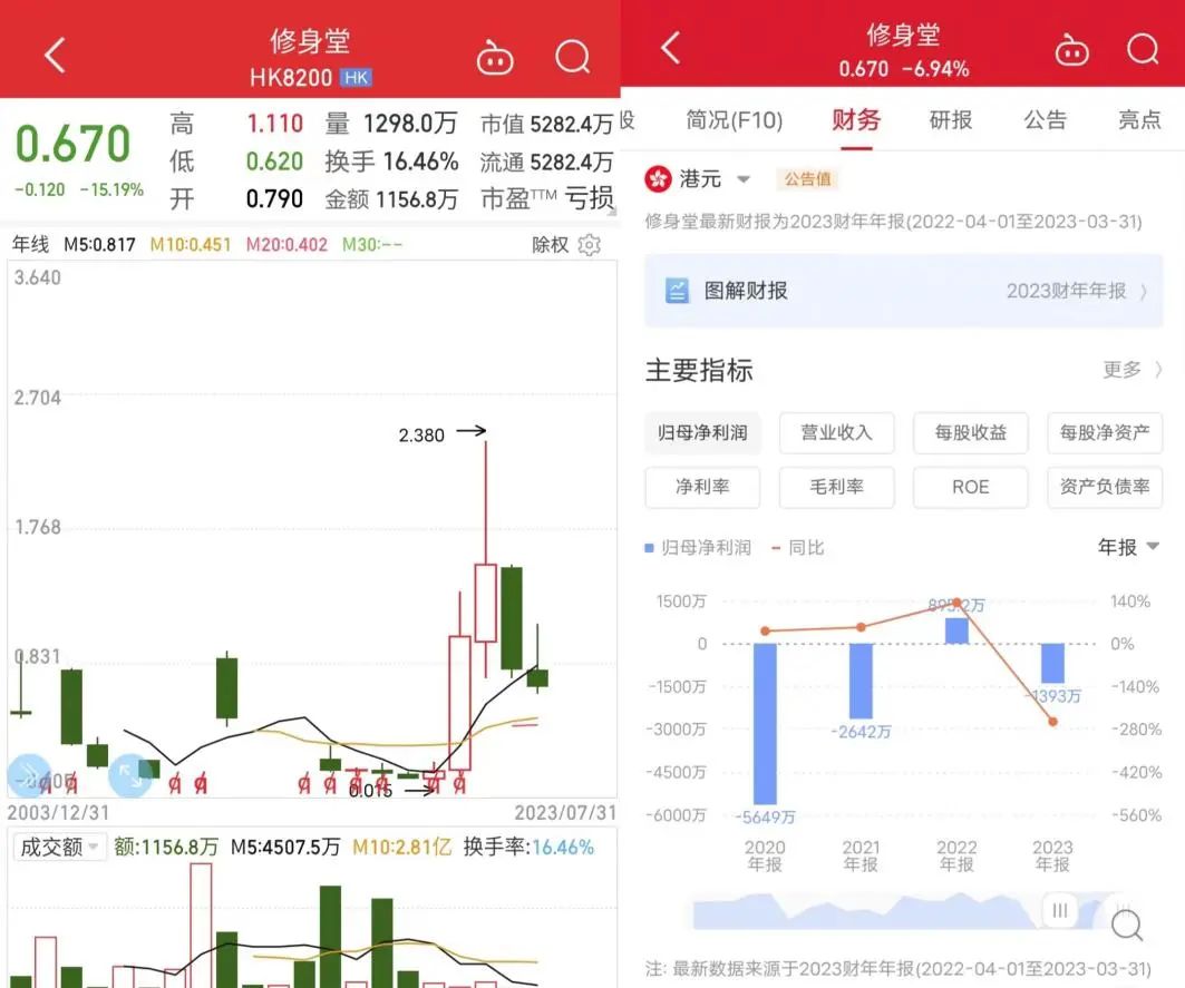 不过,目前来看,修身堂已成为一个“仙股”,经营状况也不容乐观。2023年年报显示,公司亏损1393万港元。