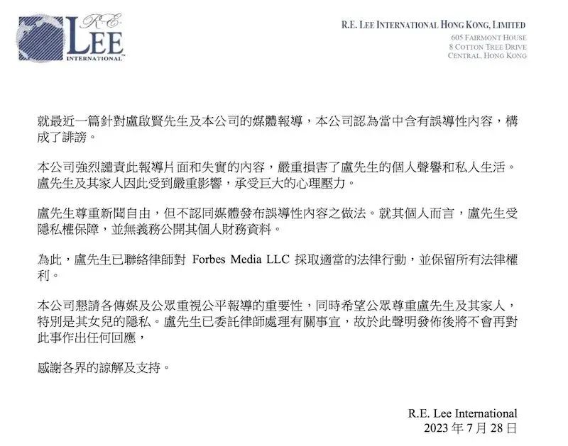 7月28日,R.E Lee International(亚溢利国际)坐不住了,代表卢启贤发表声明,回应称《福布斯》的报道误导、偏颇,已经指示他的律师采取一切适当的行动,起诉《福布斯》。