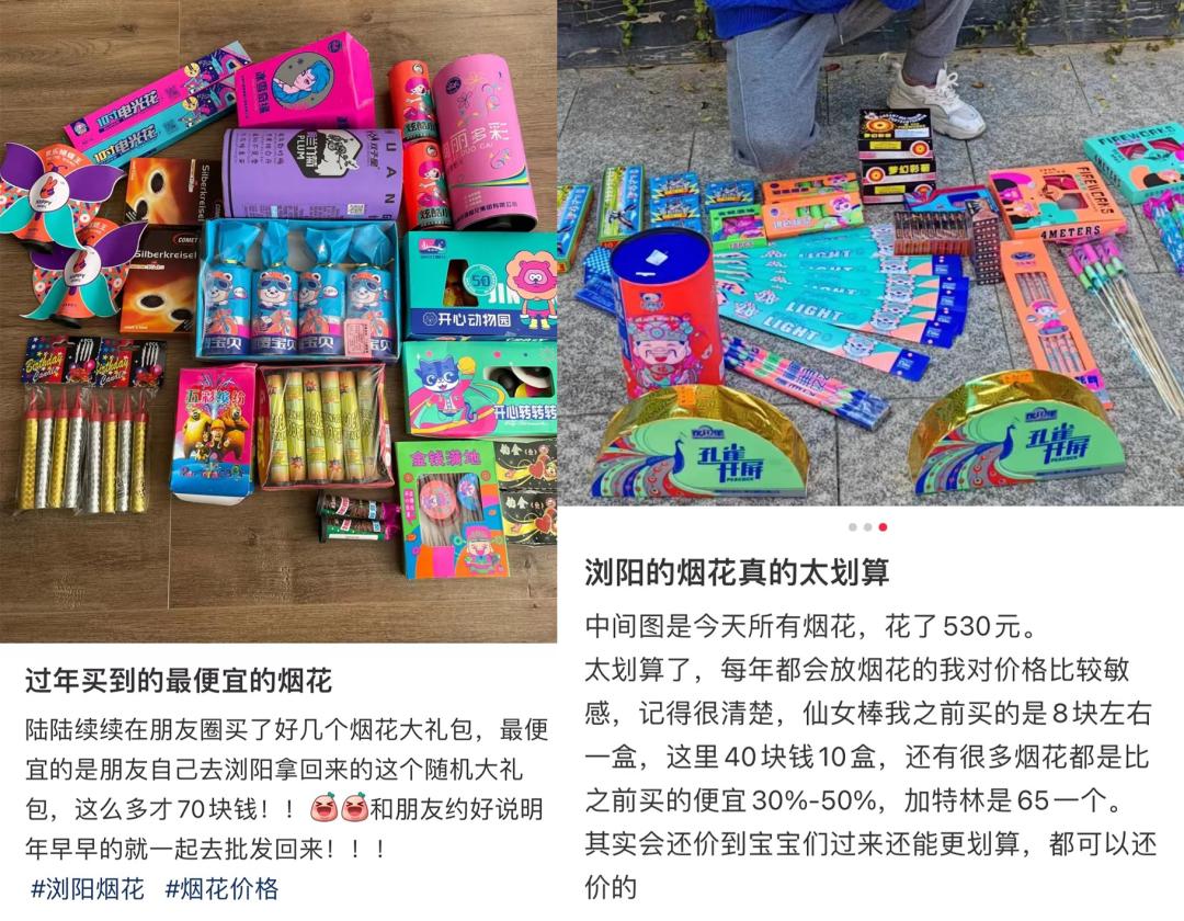 网友晒出浏阳烟花,花样多且便宜。/小红书@丁程爱出门、小红书@momo