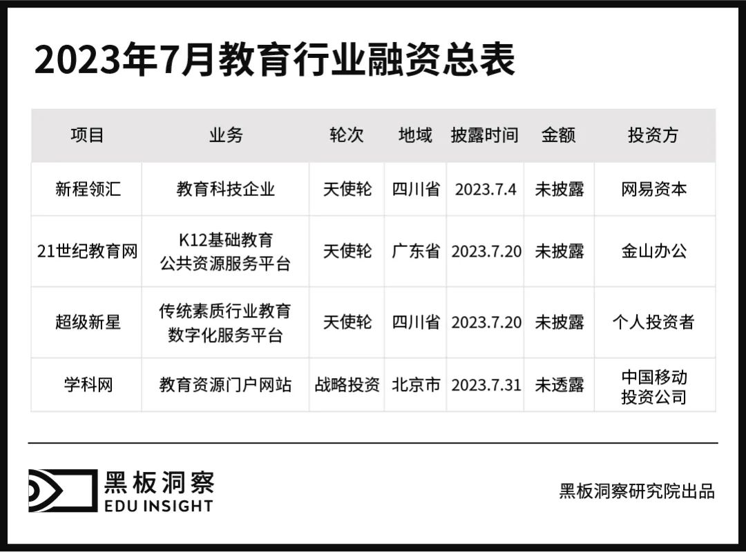 如按照黑板洞察惯例,未披露融资额的事件不计入融资总金额中,那么 7 月教育行业融资总额为 0 元。