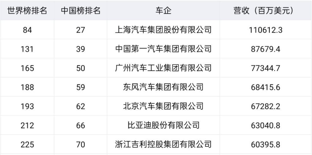就中国车企而言,本次上榜的9家企业分别为上汽集团、一汽集团、广汽集团、东风集团、北汽集团、比亚迪、吉利、宁德时代和怡和集团。对应的,去年上榜的潍柴动力,被宁德时代取代,在今年未能成功进入世界500强榜单。