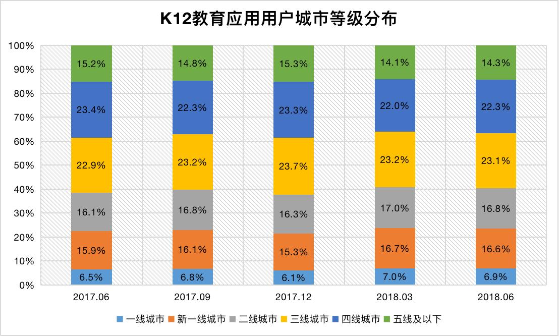 极光统计过一组数据,2017年6月-2018年6月K12教育应用用户城市分布中,来自三线及以下城市占比高达六成以上。