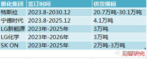除了特斯拉和宁德时代,全球装机量排名靠前的动力电池厂商LG新能源和SK On,以及LG化学也曾与雅化集团签订了2023年至2025年长达三年的电池级氢氧化锂供货合约,氢氧化锂的供货数量分别是不超过3万吨、2万吨至3万吨和3万吨。