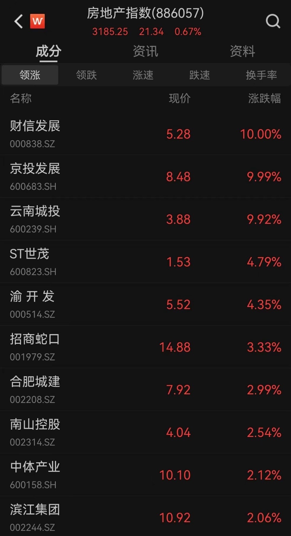 地产股继续走强,云南城投4连板,京投发展、财信发展、渝开发、合肥城建等涨幅居前。