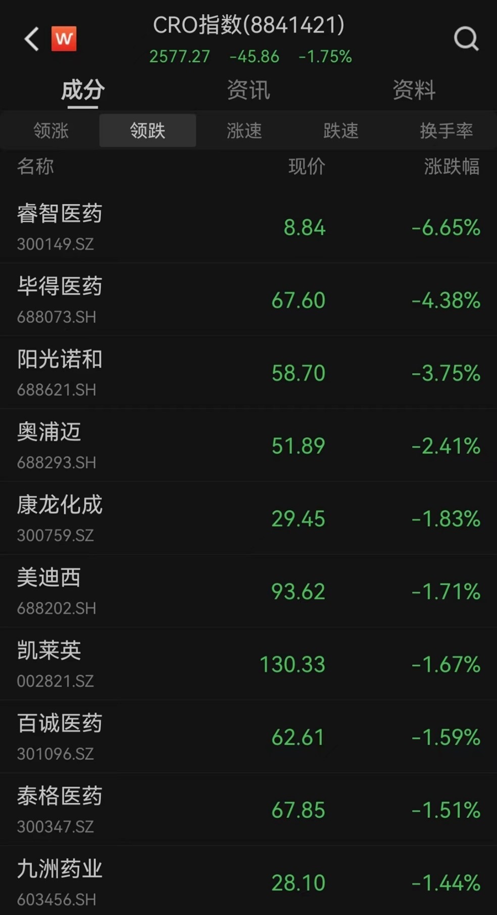 医药医疗股震荡走低,CRO方向领跌,睿智医药跌超7%,赛托生物、信立泰、毕得医药、阳光诺和、仙琚制药等跌幅居前。