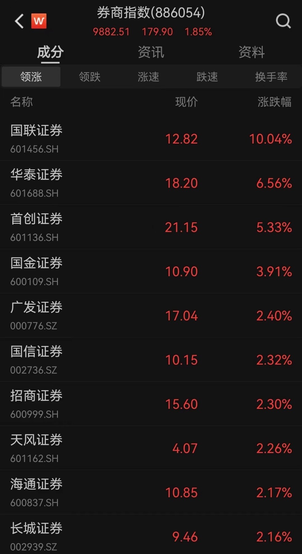 大金融板块表现亮眼。券商股开盘拉升,国联证券一字涨停,首创证券、东方财富、东吴证券、国盛金控、国元证券、信达证券等集体高开。