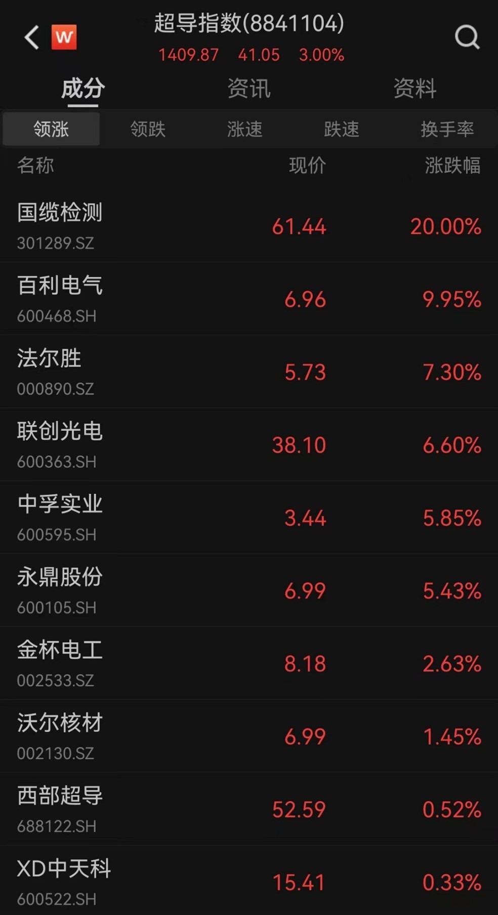 经历早盘的调整后,超导概念午后快速回升,国缆检测午后大涨超10%,早盘一度跌超12%,全天振幅超27%,百利电气冲击涨停,联创光电涨超7%,中孚实业、永鼎股份、精达股份等快速翻红。
