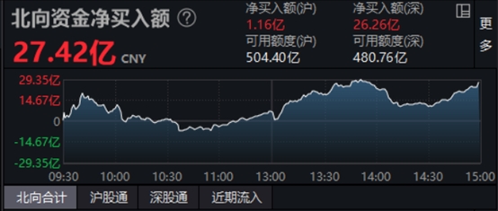 今日收盘,A股三大指数集体上涨,沪指涨0.23%,深成指涨0.67%,创业板指涨0.95%,北向资金净流入27.42亿元。