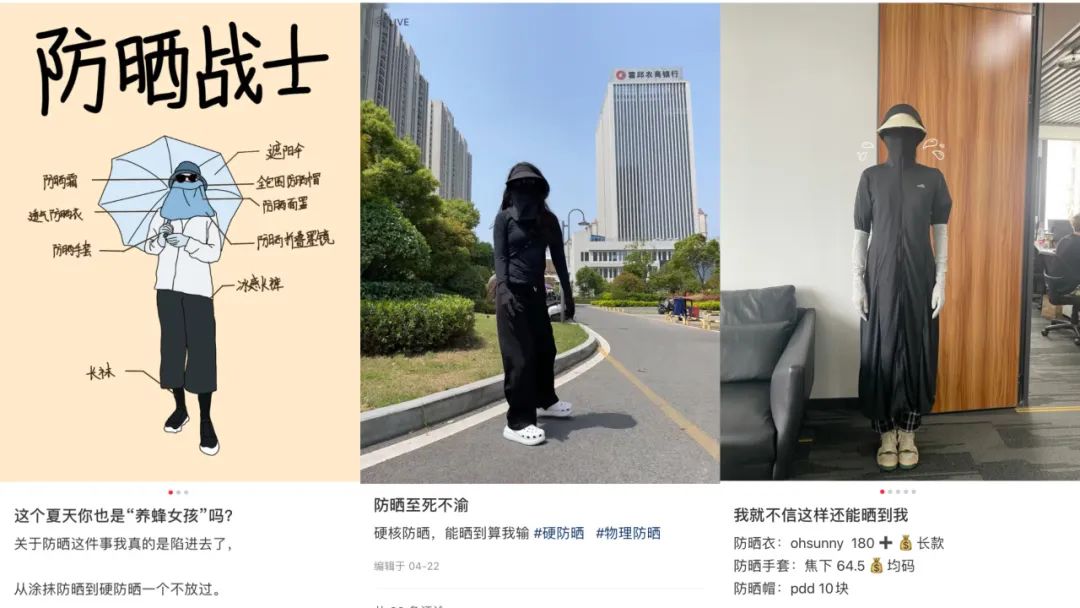 当“硬防晒”的风潮兴起,林心雨成为了朋友圈里第一个实行“木乃伊式”防晒的人。“因为常常刷到那种没做好防晒不仅变得很黑而且特别显老的帖子,所以只要被晒到就很焦虑。”所以,哪怕是高温40度的天气,林心雨也会将自己全副武装。