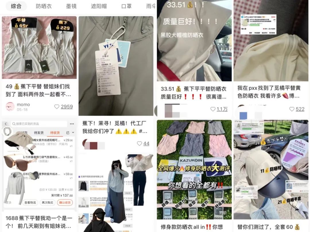 陈晶此前只买蕉下一类品牌的防晒装备,但如今她也开始搜寻“平替”,“现在的防晒衣样式太多了,如果每件都买品牌的真的很贵,看网上各种测评其实防晒效果也差不多,那还不如直接冲平替。”