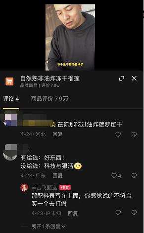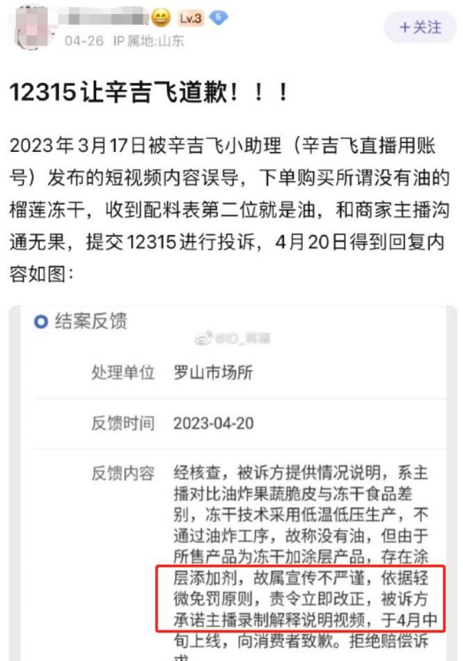 早在今年 3 月份,就有网友举报辛吉飞带货时宣称卖得榴莲冻干没有油。结果收到货后,发现配料表的第二位就是植物油。
