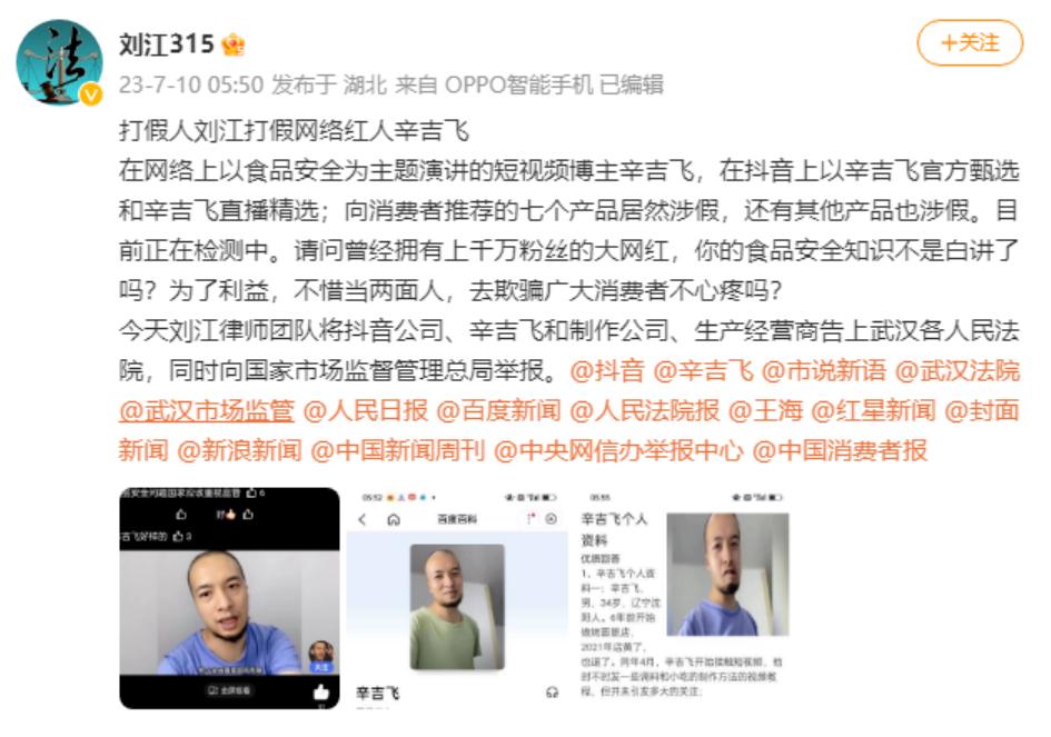 7 月 10 日,职业打假人刘江把矛头对准了去年爆红的打假斗士辛吉飞。指责他欺骗消费者,为了利益,不惜当两面人。
