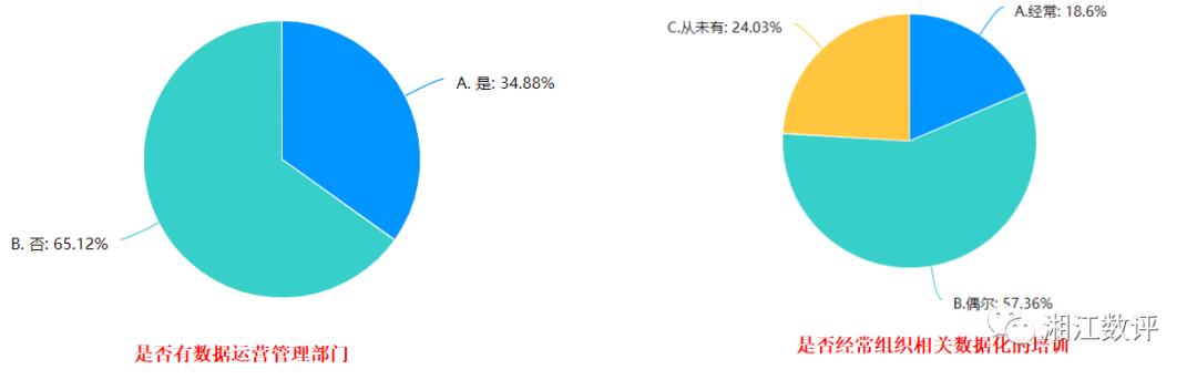 如果说企业的数据质量难以保障是领导及员工意识的问题,那么在相关组织保障方面,我们可以看到有65%的受访企业表示没有数据运营管理部门,也就是说大部分的企业未将数据管理提升至战略运营的高度,缺乏足够的重视程度,数据化管理不仅需要意识更需要专业化的知识,所以培训显得格外重要,在“是否经常组织相关数据化的培训