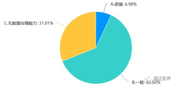 数据的治理能力是企业数据质量的最重要的保障手段,但在此次调研中有近62%的受访企业表示企业的数据治理能力一般,有近31%的企业表示无治理能力。