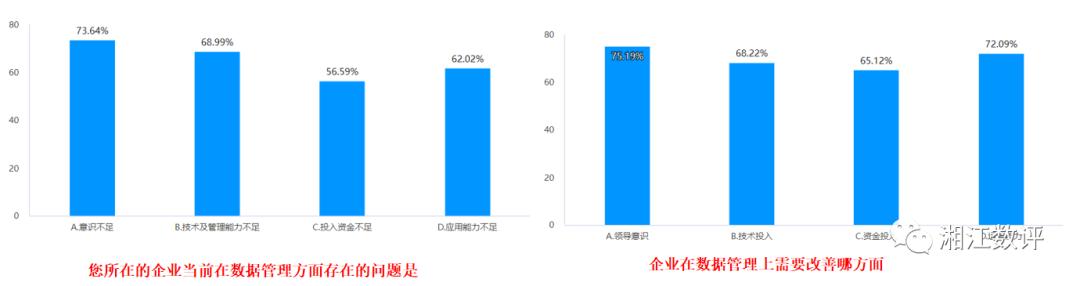 那么企业当前在数据管理方面存在的问题是什么?通过此次调研发现意识不足仍是影响企业数据应用能力的最大拦路虎,其次是技术及管理能力的问题,占比近69%;那么在数据管理上需要改善以下哪方面?有近75%的企业表示还是领导的意识需要提升,其次近72%的企业表示企业的数据运营管理能力想提升,所以企业的领导者要在意识上重视数据化建设,更要在战略运营高度来落地数据化的管理工作。