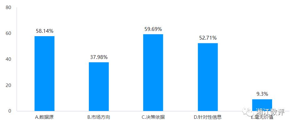价值永远是企业数字化转型建设的最终体现,那么在认知的层面数据化建设能为企业能提供什么?有近60%的受访企业表示是决策依据,这是最理想的想法,但大部分企业难以做到;所以在最初的数据意识层面有58%的企业认为数据建设只能提供数据源,有近53%的企业认为是为工作场景提供针对性的信息,所以认知决定了企业数据化建设的深度与价值。