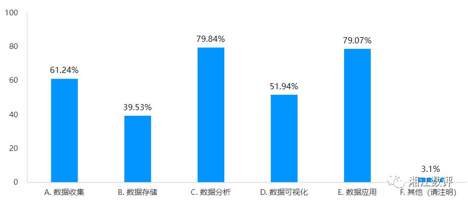 企业需要加强数据化的哪些能力?在调研问卷的反馈中我们看到有近80%的企业选择数据分析能力,有近79%的企业选择应用能力,有近61%的企业选择数据收集能力,企业在数字化转型建设过程中想提升数据的应用效果、展示数据的价值只有在数据分析能力上下功夫,同时保障数据质量是关键,所以企业也必须在数据采集源头上加大力度管理。
