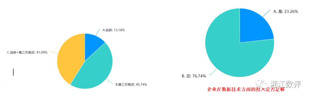 在大数据系统的引进方面有46%的企业表示采用第三方采购的形式,而也有41%的企业表示采用自研+第三方采购的形式,而这些企业均为行业头部企业,本身具有一定的技术研发实力,采用自研+采购模式可解决个性化功能满足的问题,因为大数据类的软件产品除了技术本身外重要的是行业经验的积累与迭代,企业只所以采购第三方的产品也是想对行业经验的快速复制与迭代,因此从调研中我们可以看出只有13%的企业选择了自研大数据产品。企业在数据技术方面的投入是否足够的调研中我们毫无悬念的看到有77%的受访企业表示是不够的,数字化的投入问题一直是影响企业数字化建设的重要因素,价值体现难是其中最重要的原因。