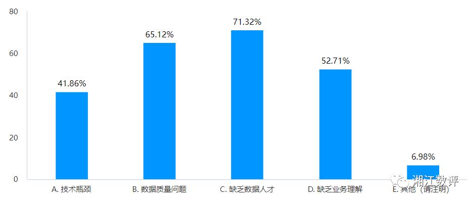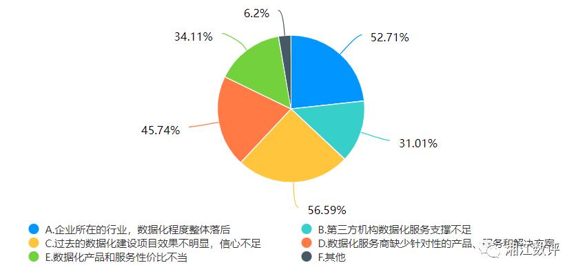 企业数字化转型过程是充满艰辛的,数据化建设与应用作为数字化转型的核心环节存在诸多困难与问题也是正常不过的,在此次调研中失败对于企业数据化建设进程的影响是非常大的,有近57%的企业表示“过去的数据化建设项目效果不明显,导致当前数据化建设信心不足”,而有近53%的企业表示“企业所在的行业,数据化程度整体落后”,也就是说难以在行业中汲取数据化建设的相关经验。