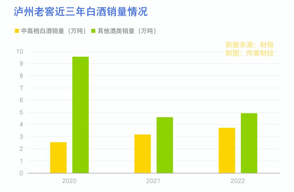 销量上,泸州老窖中高档白酒销量从2.53万吨增加到了3.71万吨,其他酒从9.56万吨减少到了4.9万吨。一增一减的背后,国窖品牌销售规模近200亿元,泸州老窖特曲销量超60亿元,窖龄酒规模突破20亿元。