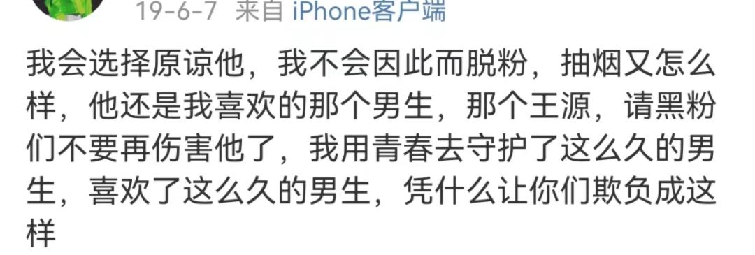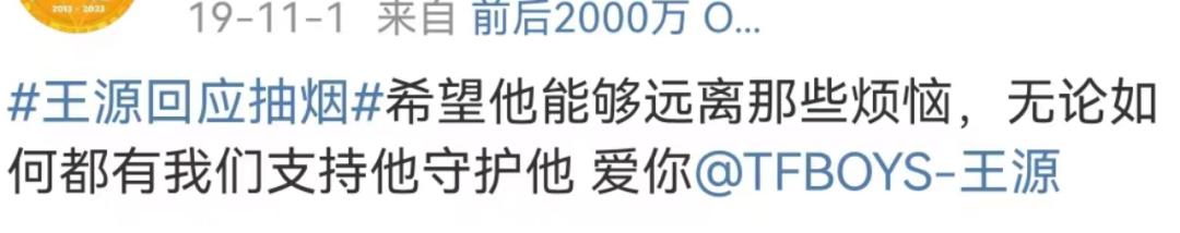 此外,粉丝对TFBOYS也有较高的包容度。TFBOYS的不完美,是可以被理解的,甚至会被认为是他们的可爱之处。当TFBOYS有爆出黑料时,四叶草们会主动站出来“保护”TFBOYS。比如2019年王源被爆出抽烟的照片时,不少粉丝在微博上力挺王源:“我用青春去守护了这么久的男生,凭什么让你们欺负成这样”“无论如何都有我们支持他守护他”。