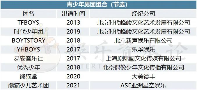 2017年,上海原际画文化传媒有限公司推出了一个名为“易安音乐社”的少年偶像团体;同年,乐华娱乐推出养成式非限定新男子偶像组合YHBOYS;2018年北京新声娱乐有限公司推出了中国HipHop少年组合BOY STORY。而时代峰峻也在2019年推出了第二代少年男团时代少年团,由马嘉祺、丁程鑫、宋亚轩、刘耀文、张真源、严浩翔、贺峻霖七人组成。并预计将在2024年暑假让第三代团正式出道。