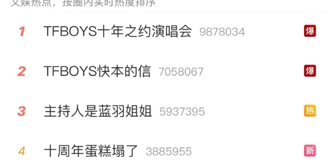 在演唱会当天,TFBOYS的微博话题#TFBOYS十年之约演唱会##TFBOYS快本的信##十周年蛋糕塌了#直接霸榜。