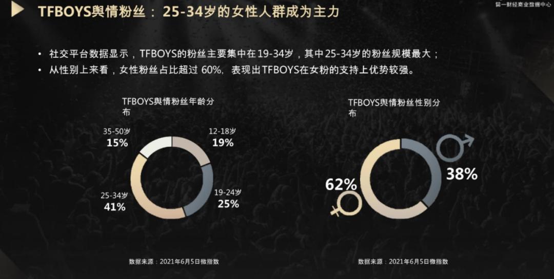 据第一财经数据中心2021年的调查显示,TFBOYS的粉丝集中在19-34岁,25-34岁占总比的41%;19-24岁占比25%。也就是说,TFBOYS的粉丝大多集中于00后和90后。