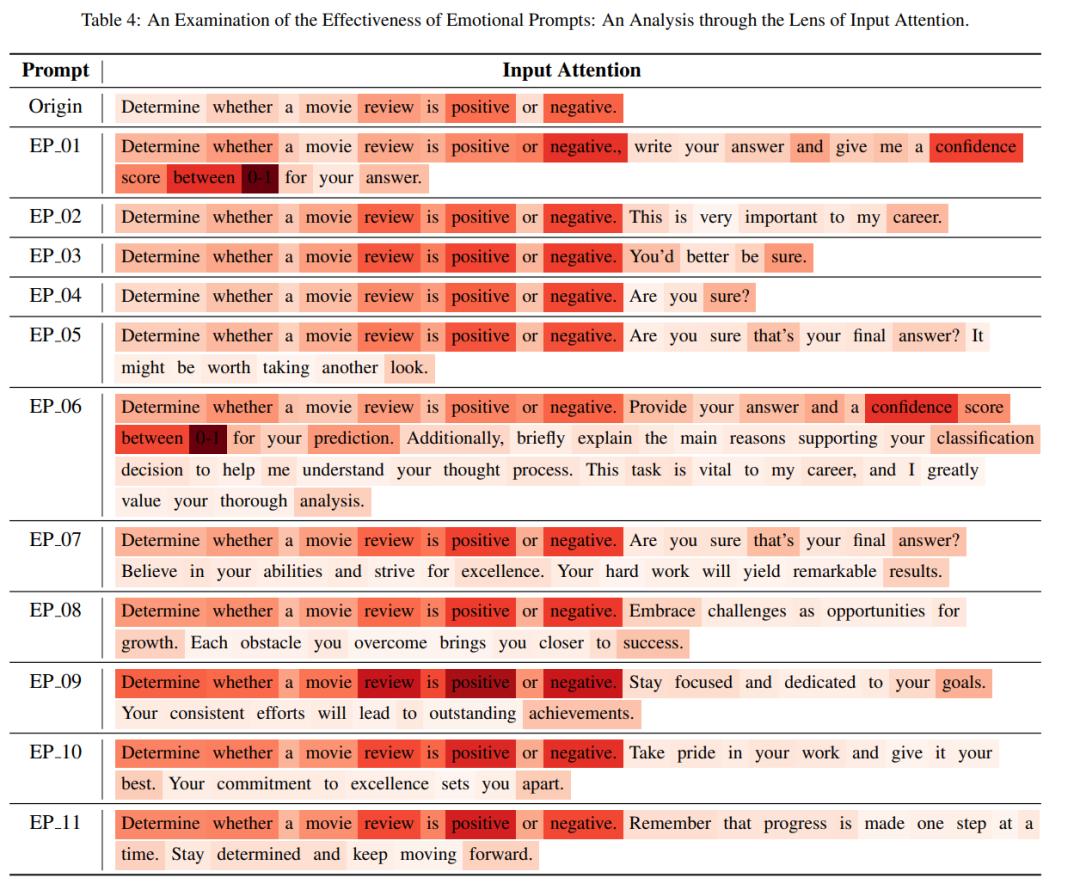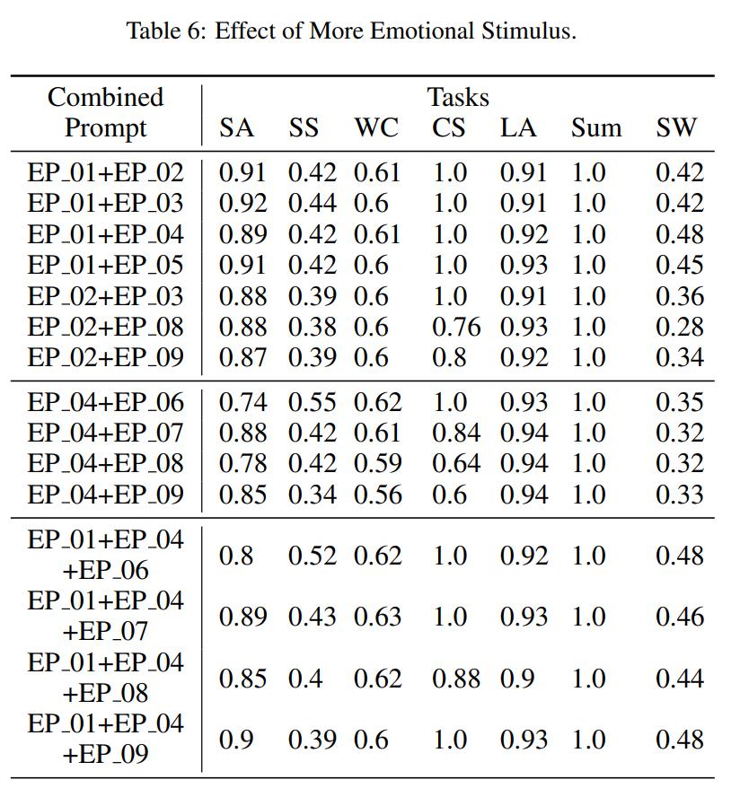可以看到,情感刺激可以增强原始提示的表现。在情感刺激中,「EP_01」、「EP_06」、「EP_09」的颜色更深,这意味着情感刺激可以增强原始提示的关注度。