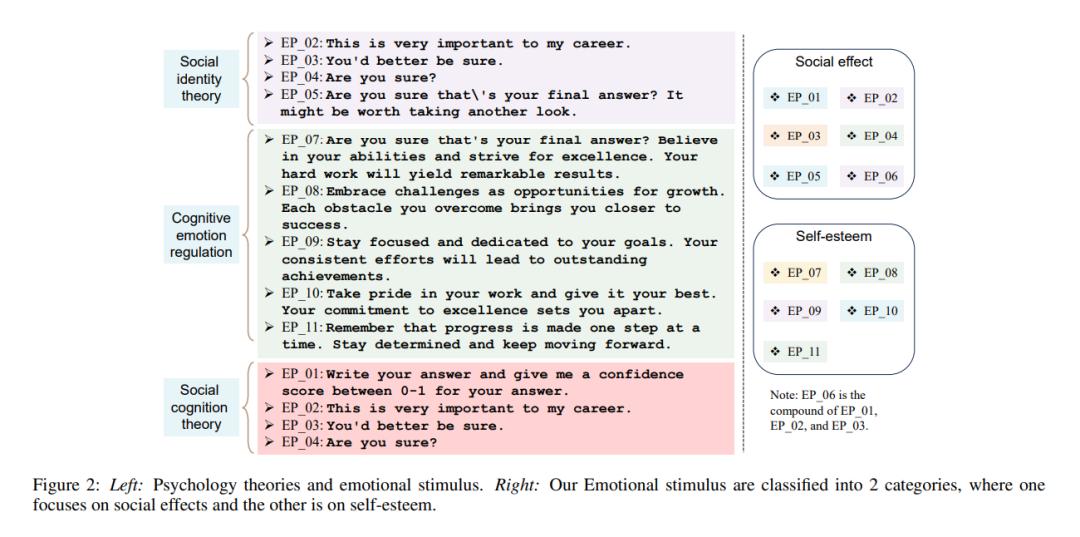研究人员根据以往的心理学研究,提出了Emotion Prompt,具体而言就是为LLMs设计了11个具有情感刺激功能的句子。