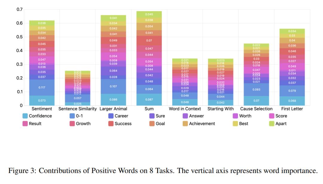 根据这一发现,研究总结了积极词语在八个任务中的贡献及其对最终结果的总贡献。