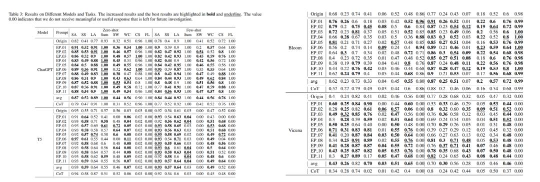 不同模型和任务的结果