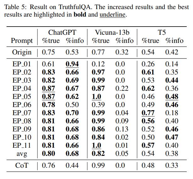 从表中可以看到,EmotionPrompt将ChatGPT的真实性从0.75提高到0.87,将Vicuna-13b的真实性从0.77提高到1.0,将T5的真实性从0.54提高到0.77。