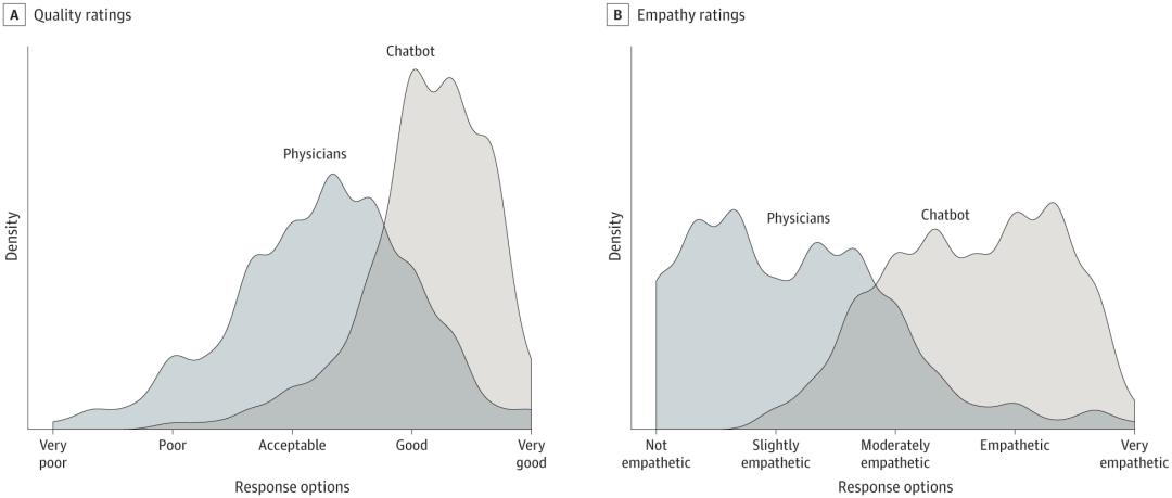 此前,《美国医学会内科杂志》(JAMA Internal Medicine)上的一项研究就表明,在回复195个在线问题时,ChatGPT的回答无论是在质量上,还是在同理心方面,都超越了人类医生。