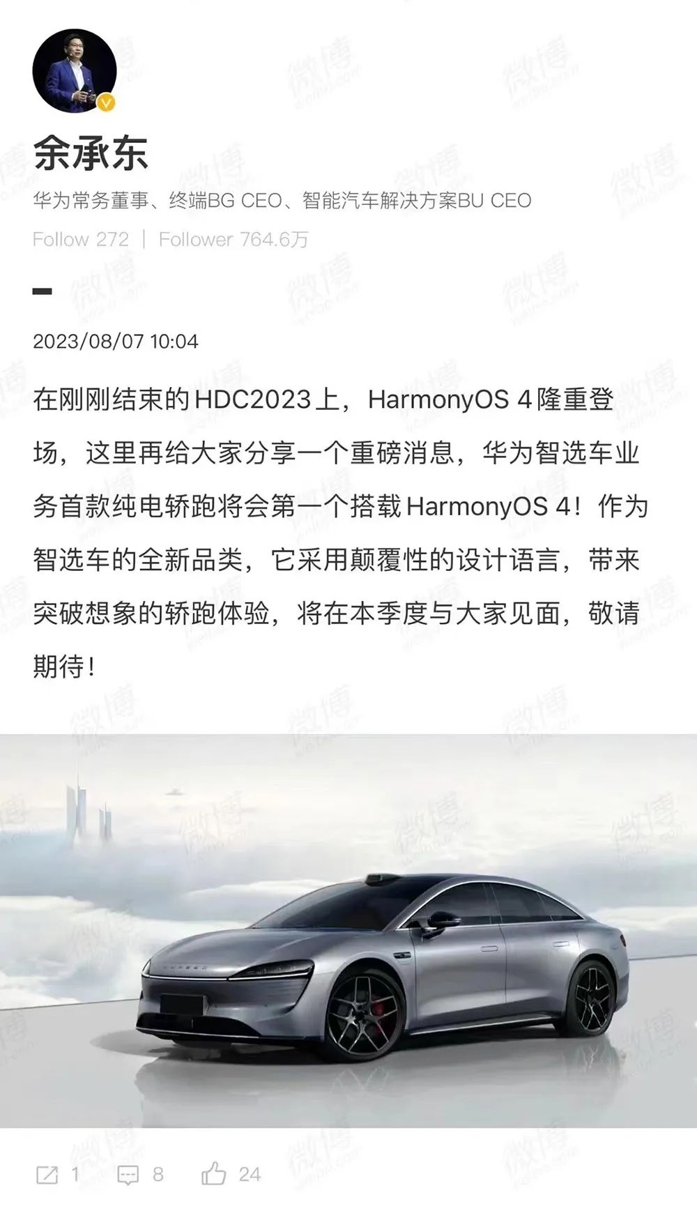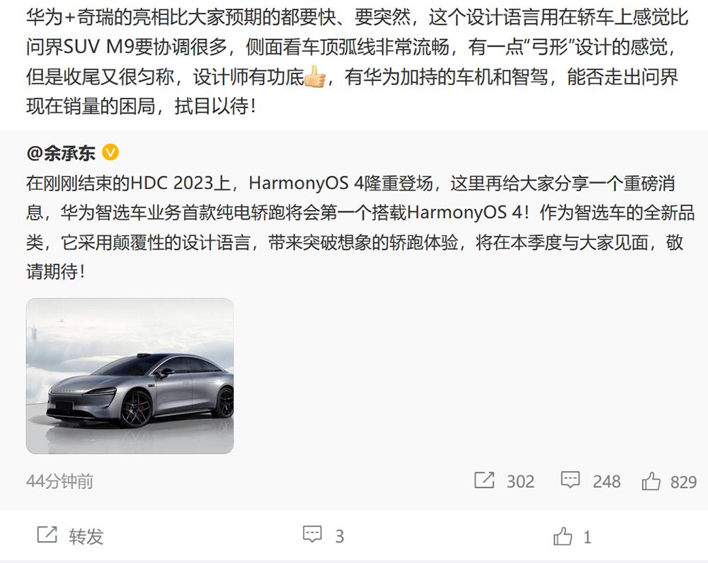 余承东剧透华为系纯电轿跑:首搭鸿蒙4.0,奇瑞制造