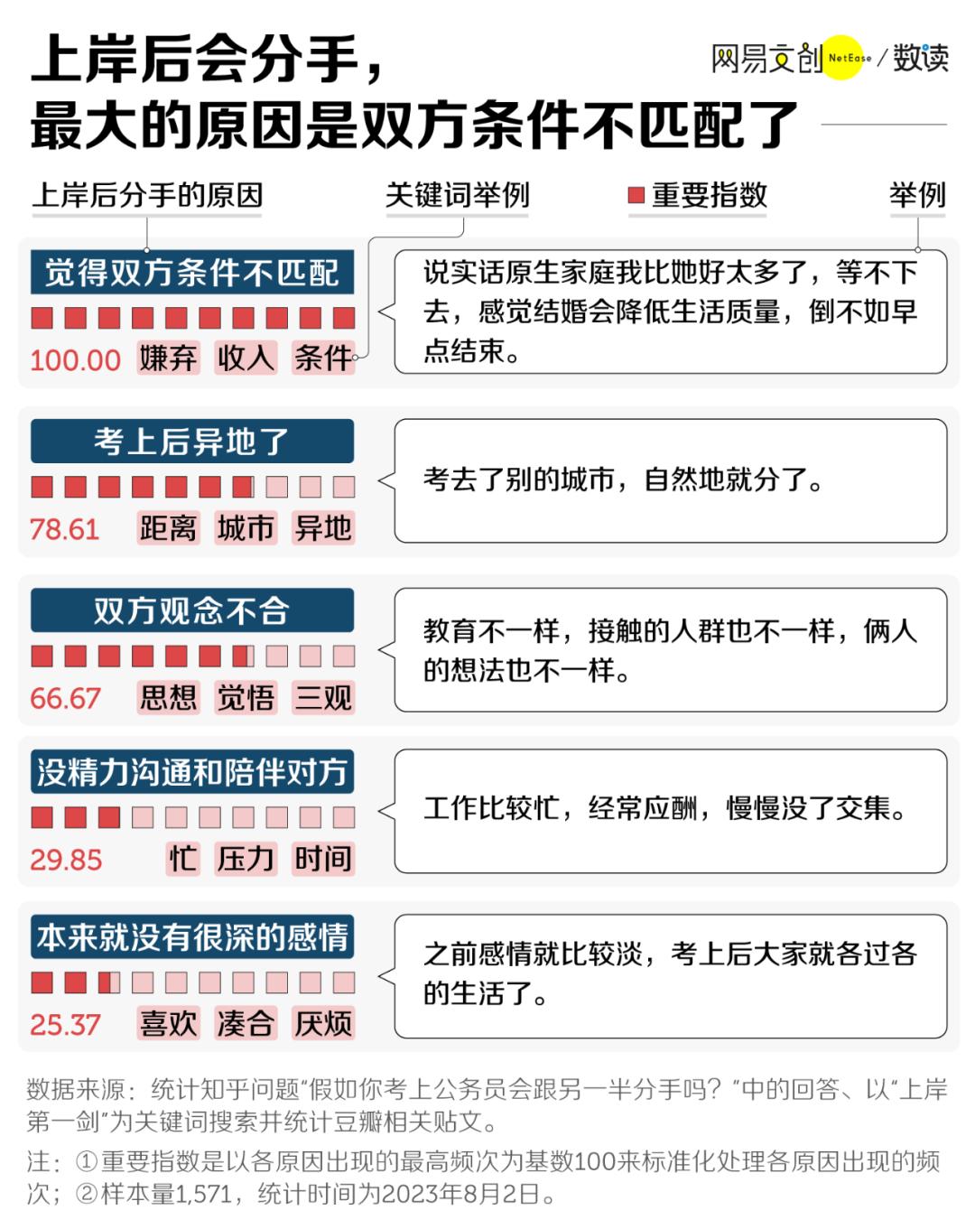 我们统计了知乎和豆瓣中的相关讨论,发现在上岸后要不要分手的问题中,很多人都提到“收入”“阶级”“条件”等字眼。