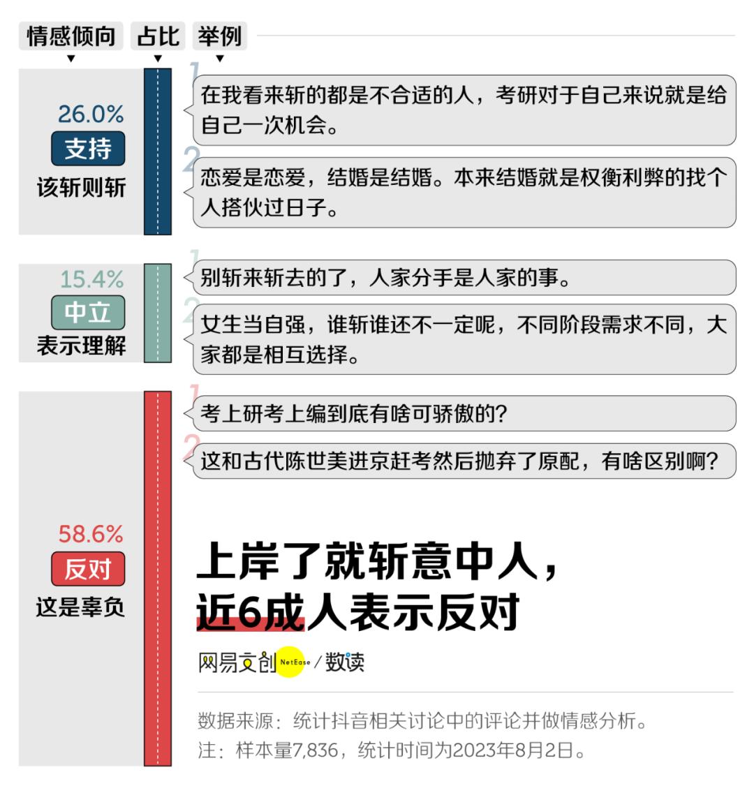 我们统计了抖音关于“上岸第一剑,先斩意中人”的 7836 条讨论,发现有约四成的人对此表示支持或理解。