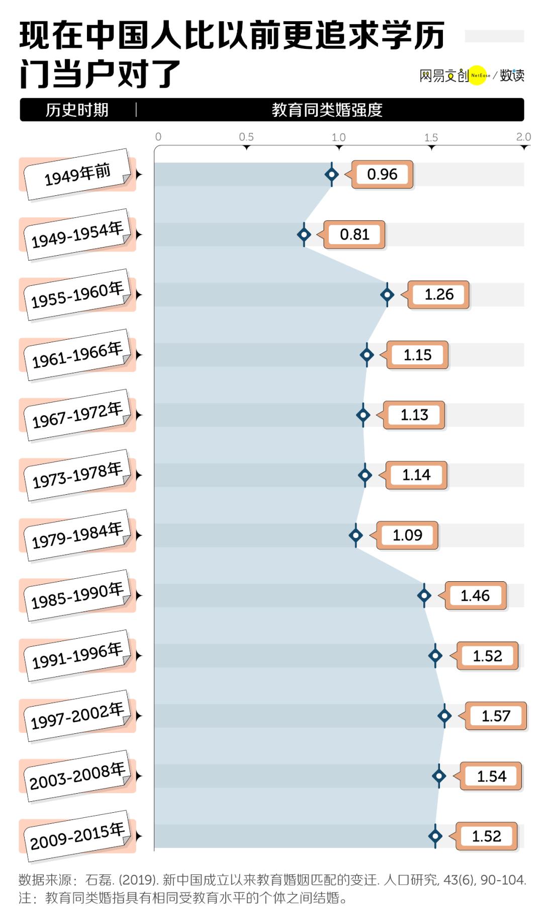 从 1949 年到 2015 年,中国人的教育同类婚强度从 0.81 上升至 1.52 [3]。