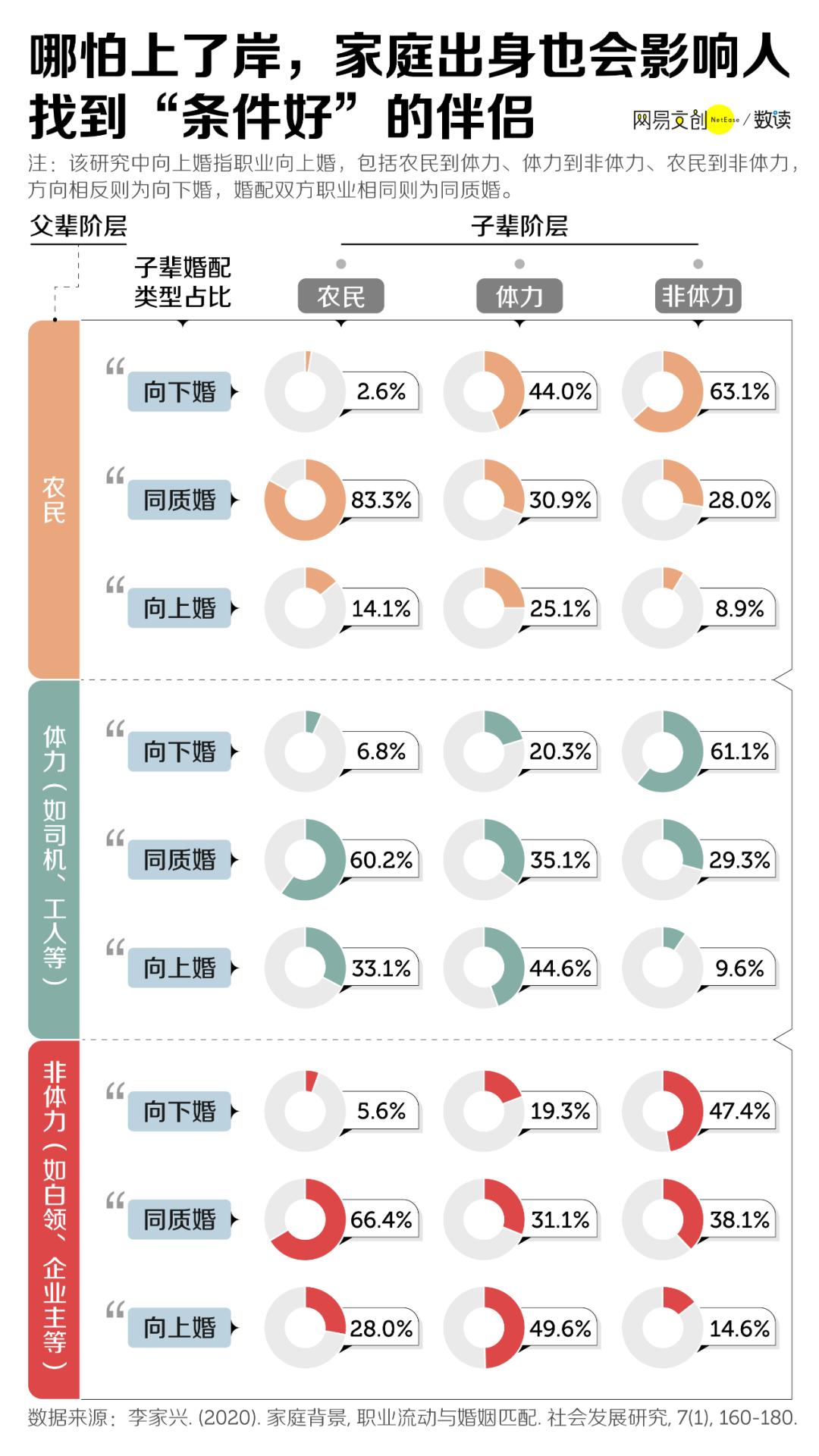 而家庭出身好的人,哪怕自己工作不如意,也更容易在家庭的影响下向上婚配,弥补自身职业带来的弱势 [9]。
