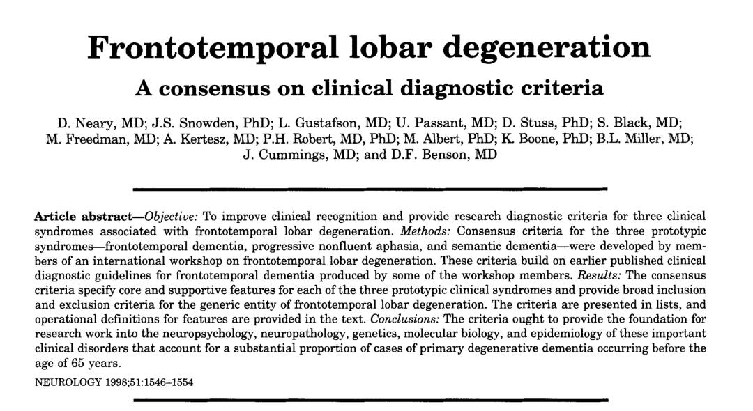 千禧年前后,Neary 等人提出 [2] ,额颞叶变性在 65 岁之前发生的原发性退行性痴呆病例中占较大比重。 患有额颞叶痴呆的病人可能在行为变化、言语问题、运动障碍上呈现出不同的特征。