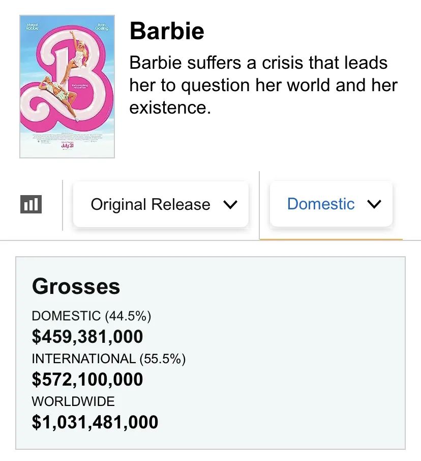 本以为会成为又一个失失败烂片的电影《芭比》,以对存在主义和平权概念的喜剧化讲述,打破了观众对真人化电影的刻板印象。截至目前,其全球票房已突破10亿美元,电影导演格蕾塔·葛韦格也成为了全球票房最高女导演。