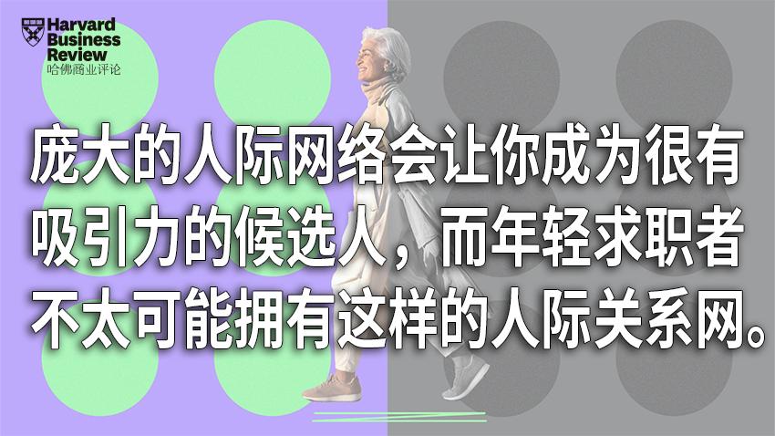 还有,对于某些职位,庞大的人际网络会让你成为很有吸引力的候选人,而年轻求职者不太可能拥有这样的人际关系网。举例来说,你在销售或业务开发等工作中的客户或联系人可以扩大你的社交面、影响力和让下一家公司受益的能力——这点让你比那些没有业务记录、没有深厚行业关系的年轻求职者更有价值。