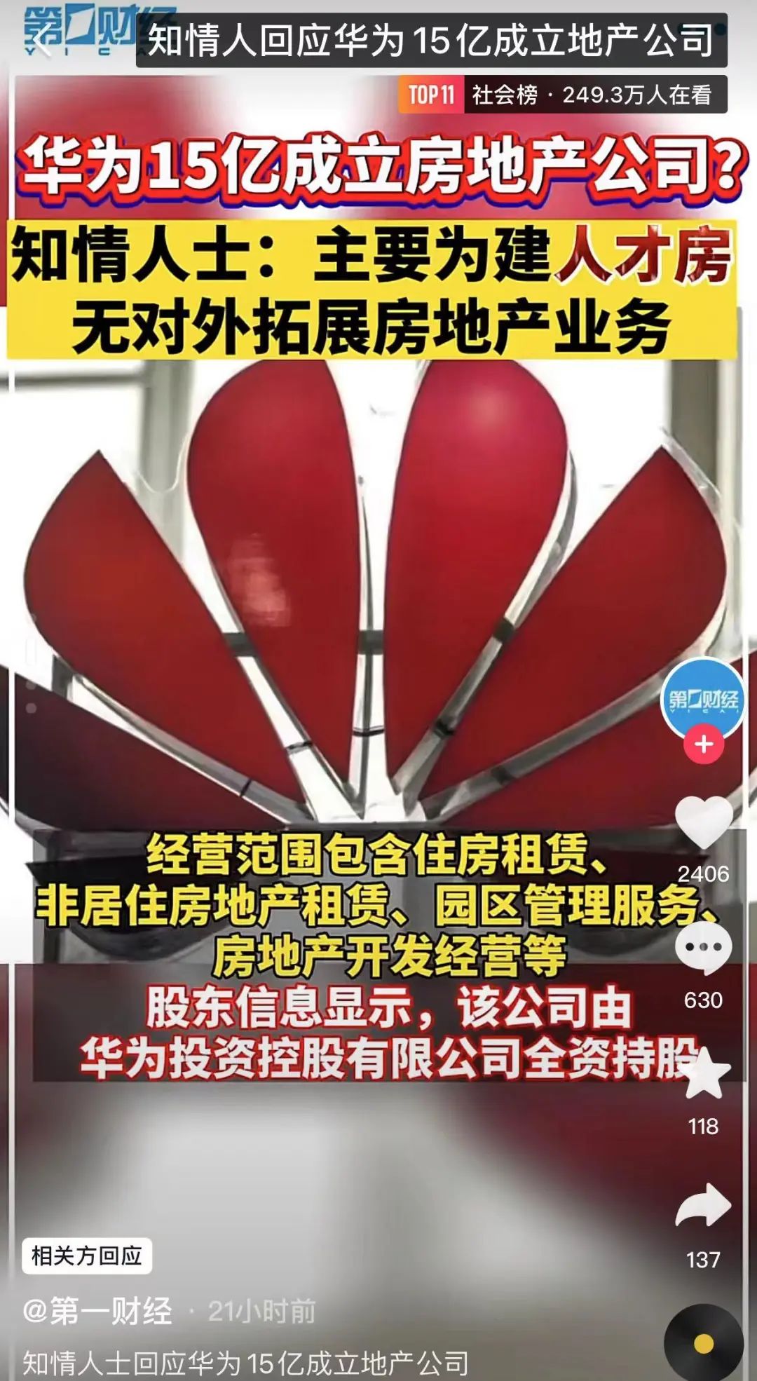 华为15亿成立房地产公司,目前知情人士的回应是该公司主要承担建设、管理园区配套人才房功能,无对外拓展房地产业务属性。