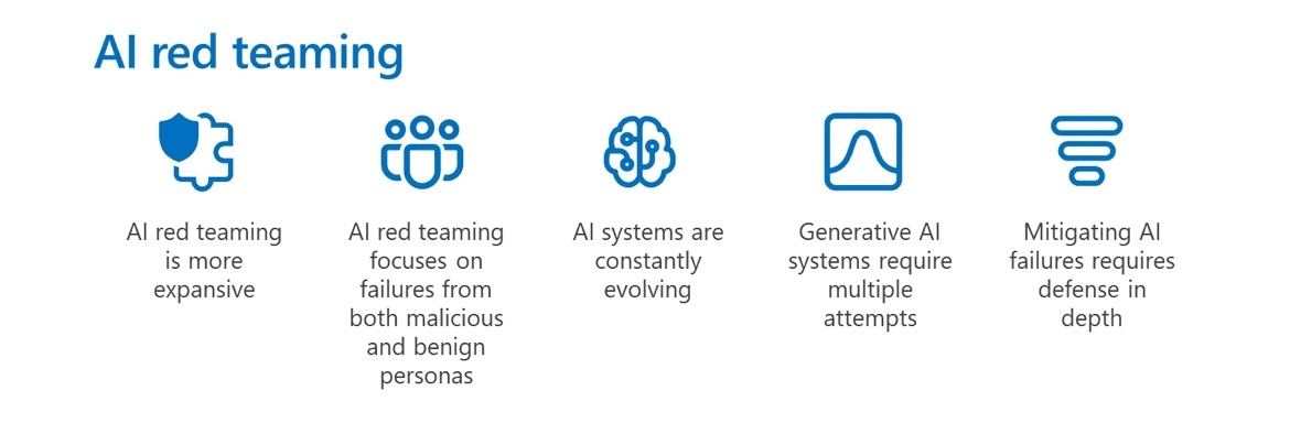 - AI系统在不断发展:AI系统的变化速度比传统应用更快,需要进行多轮红队测试,建立系统化、自动化的测量和监测系统。