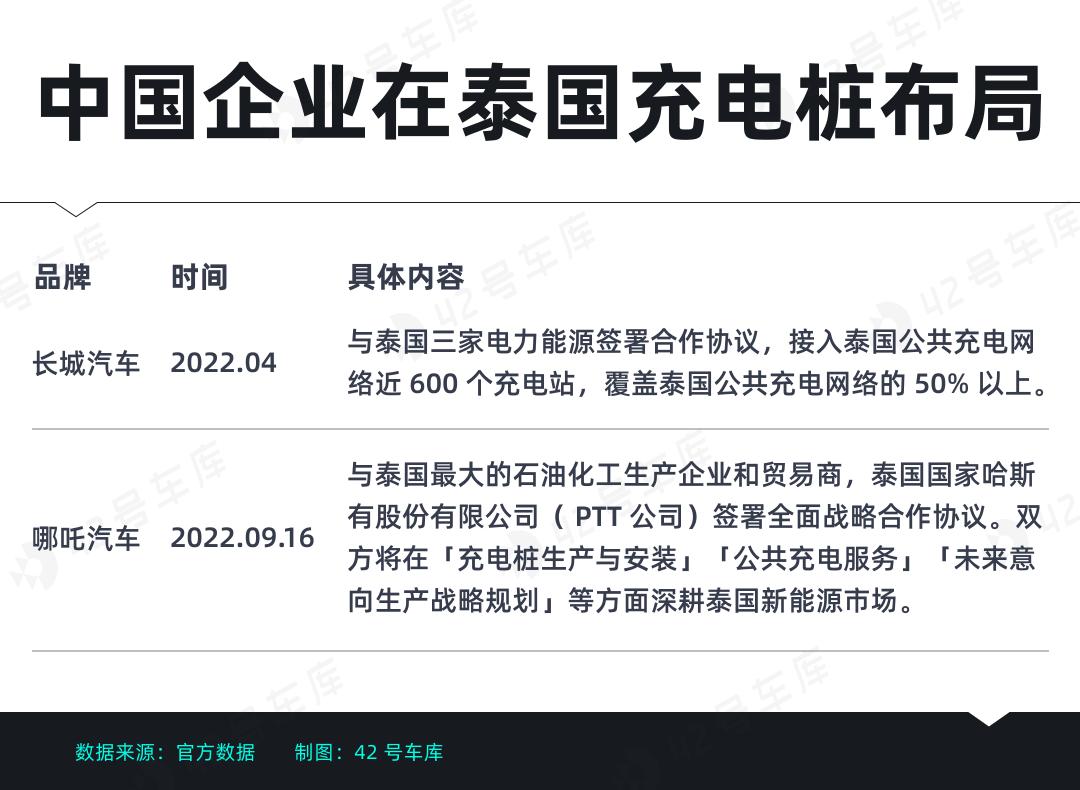 比如说,2022 年长城汽车的泰国工厂与泰国三家电力能源签署合作协议,接入泰国公共充电网络,第一座「光储充一体」超级充电站已在泰国运营,建设的充电站可覆盖泰国公共充电网络的 50% 以上。
