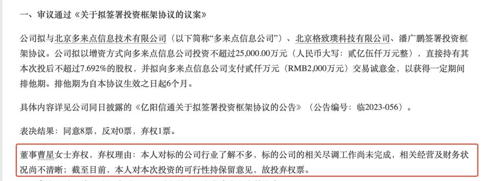 值得一提的是,ST信通在第九届董事会第二次会议上审议该投资议案时,董事曹星投了弃权票,弃权理由为不了解标的公司行业,并表示“标的公司的相关尽调工作尚未完成,相关经营及财务状况尚不清晰”,对此次投资的可行性持保留意见。